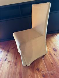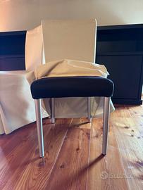 Vendo n.8 sedie da sala con seduta in stoffa blu notte, gambe in acciacio satinato ed ognuna con il proprio copri sedia come da foto, dimensioni: 42x45x86h.