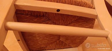 Tris di sedie da cucina in legno con seduta in paglia. Colore neutro decapato. Seduta perfetta, integra, nessun sfilacciamento. Dimensioni: altezza totale da terra cm 85, dimensioni seduta 40 cm x40, larghezza schienale 45 cm.
