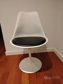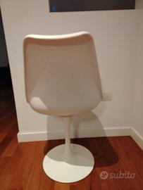 Sedie non di marca ma di alta qualità, di colore bianco, con gambe in acciaio. Il cuscino è rivestito in simil pelle e l'imbottitura le rende confortevoli.