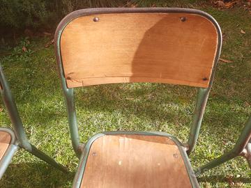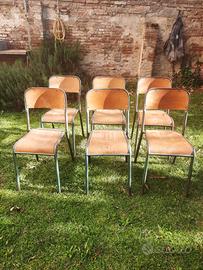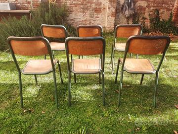 Sei sedute da scuola con struttura in ferro e seduta e schienale in legno. Presentano scritte e segni di usura ma in buono stato. Comprate in Francia.