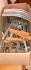 in legno con bordi in alluminio e struttura in ferro da tassellare a terra.