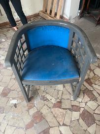 È un modello della metà del ’900, dal design innovativo e attuale e di sicura esclusività. Panno di velluto nei colori rosso, blu e giallo. Manifattura di gran pregio e solidità (legno massiccio dell’epoca oiegato a vapore). 18 sedute blu, 2 sedute rosse e 7 gialle. Introvabili. Ovviamente non perfette a causa del tempo e dell’utilizzo (vecchio hotel di Cortina). Prezzo cadauna 100 non trattabili se non in blocco.