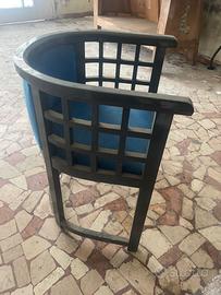 Sedie o poltroncine con braccioli in stile barrel (a botte), caratterizzate dalla struttura curva che avvolge la seduta, con schienale e fianchi continui.