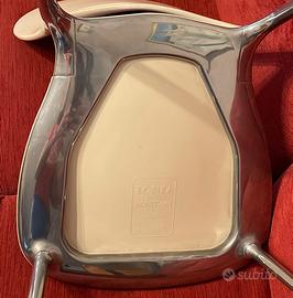 53 cm.Altezza 84 cm. La struttura in alluminio della seduta è un’unica fusione dove poi sono state collocate incastrate le gambe. Sempre la seduta in nylon anch’essa è incastrata perfettamente senza viti, così come lo schienale che si inserisce su due perni che si incastrano nella struttura in alluminio. Le sedie sono perfettamente pulite e l’intera struttura in alluminio è stata lucidata adeguatamente. Sono sedie veramente belle che pesano 6 kg l’una. Possono essere inserite in qualsiasi contesto consono che le possa accogliere come una scrivania, un piccolo tavolo della cucina, un salone e in qualsiasi contesto una voglia . Il prezzo si riferisce a tutte e tre le sedie che preferirei vendere in Blocco per non ritrovarmi con pezzi singoli. Nel caso di acquisto previa visione, sarà molto semplice caricarle nel baule di una macchina a cinque posti, tirando giù i sedili posteriori.