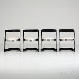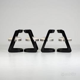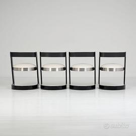 Elegante esempio del design sofisticato degli anni ’70, questo set di sedie attribuito a Willy Rizzo si distingue per il suo forte carattere scultoreo e l’uso raffinato dei materiali. Linee decise e geometrie audaci si combinano in una struttura che unisce funzionalità e presenza estetica. Design e stile Il design è dominato dalla struttura a “Z” in legno laccato nero, elemento iconico che conferisce dinamismo e solidità visiva. La seduta, imbottita e rivestita in chiaro, è incorniciata da una fascia metallica che aggiunge un contrasto materico elegante e tipicamente glamour, cifra distintiva dello stile di Willy Rizzo. Il risultato è un equilibrio perfetto tra rigore formale e lusso discreto, pensato per ambienti sofisticati e contemporanei. Caratteristiche Struttura in legno laccato nero Design a slitta con profilo a “Z” Seduta imbottita rivestita in tonalità chiara Dettaglio perimetrale in metallo lucido Forte impatto scenografico Condizioni Le sedie si presentano in buone condizioni generali, con lievi segni del tempo coerenti con l’età: Struttura solida e stabile Superfici ben conservate Sedute confortevoli e ben mantenute Un’icona di eleganza anni ’70 Dimensioni Larghezza 49 Profondità 49 Altezza 70 Seduta 42 Queste sedie rappresentano perfettamente l’estetica ricercata e cinematografica di Willy Rizzo, ideali per valorizzare ambienti dining o spazi contract con un tocco distintivo e senza tempo.