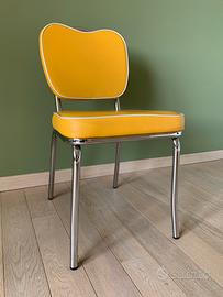 Quattro sedie di design in acciaio cronato di color giallo e profili di colore bianco con seduta e schienali imbottiti in ecopelle.