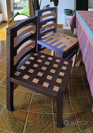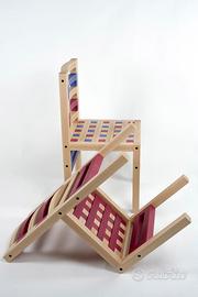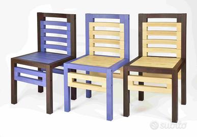 Una linea di sedute Made in Italy dal design esclusivo, lineare, unico, moderno. Il colore, dominante nella personalità di questi complementi di arredo, disponibile in quattro tinte: naturale, cioccolato, lampone e mirtillo. Le sedie sono componibili, costituite da diversi elementi, strutturali e decorativi, tutti in legno massello di faggio, rifiniti a mano e tinti al naturale, che possono essere assemblati con facilità da chiunque. (Ogni sedia è costituita da 16 elementi strutturali, per i quali la disposizione è più limitata, e 45 blocchetti decorativi che compongono la seduta e possono essere disposti a piacere).