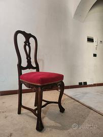Quattro sedie in legno ciliegio intagliato in rosso pompeiano con passamaneria oro. Sec. XIX ambito Nord Italia Veneto
