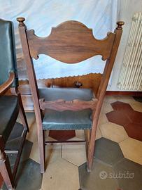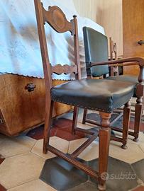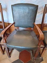 Set per studio professionale composto da 2 sedie e una poltrona per scrivania. Struttura in legno, rivestimenti in pelle di colore verde scuro in buone condizioni. Sedute imbottite ( solo nella poltroncina l'imbottitura ha ceduto un pò, mentre nelle due sedie è in buono stato.