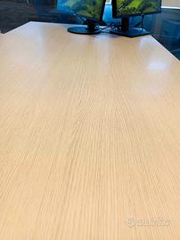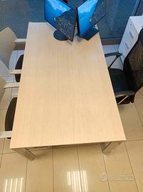 tre scrivanie in laminato rovere sbiancato con struttura in acciaio cromato e sei sedie ergonomiche e comode con seduta fissa, no rotelle.