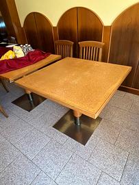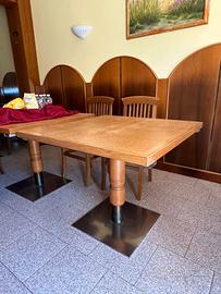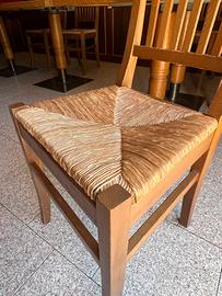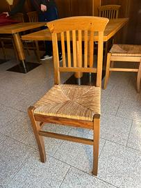 Vendo 20 sedie (altezza 49cm), 2 tavoli 125x90cm, altezza 75cm e 6 tavoli 90x90cm, altezza 75cm in legno con base metallica. Sedie impagliate. Stato: usato ma buono. Prezzo trattabile.