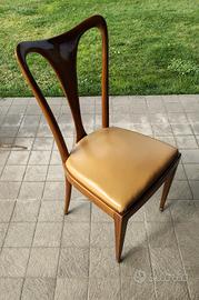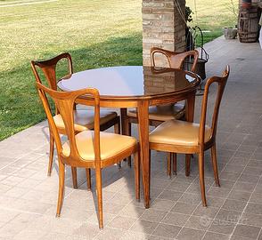 Vendo quattro sedie in stile Guglielmo Ulrich con struttura in mogano e seduta rivestita in similpelle con imbottitura a molle. Periodo anni 50 in ottime condizioni. Coordinato alle sedie vendo un tavolo rotondo con struttura sempre in mogano e piano in vetro in tinta legno. Anche il tavolo è in ottime condizioni.