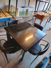 vendo un tavolo in legno originale anni 90 compreso di 4 sedie con telaio in ferro .misura da chiuso 100x100 h 76. aperto 200x100 h 76.