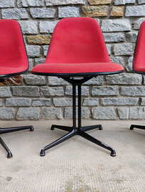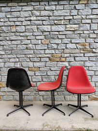 Tris di sedie con imbottitura morbida in gommapiuma rossa (in perfette condizioni), base laccata nera, scocca in vetroresina nera senza rotture o crepe