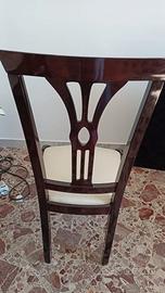 vendo 6 sedie in legno ,color scuro lucido mogano, in buone condizioni. Design elegante con schienale lavorato e seduta imbottita in tessuto chiaro, motivo discreto a piccoli puntini, comoda e raffinata. Ideale per sala da pranzo, cucina o arredamento classico. Struttura robusta e stabile. ritiro a carico acquirente .secondo piano senza ascensore