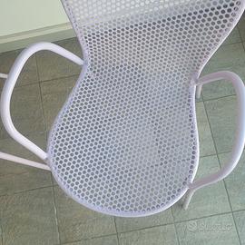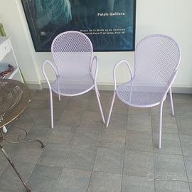Due sedie EMU in metallo con braccioli, colorazione lilla, impilabili, trattamento inedito di plastificazione dei componenti metallici, adatte sia per interno che per esterno, usate ma come nuove, altezza seduta 43 cm, vendo 90 euro. No spedizione, solo ritiro di persona.