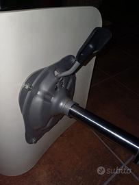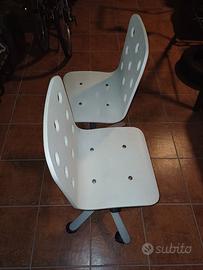 Sedie girevoli Ikea modello Jules. In buone condizioni a parte qualche piccolo segno di usura. Seduta in legno conformato regolabile in altezza con apposita leva tra 38cm e 51cm da terra. Profondità seduta 30cm; larghezza seduta 30cm; altezza schienale 35cm. Base in metallo a cinque razze con 5 ruote per ogni sedia. Raggio delle razze 27cm circa. Ruote autofrenanti, ossia in assenza di peso sulla sedia le ruote restano frenate.