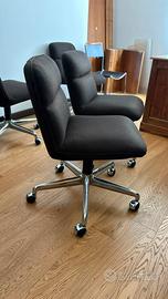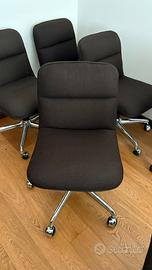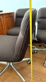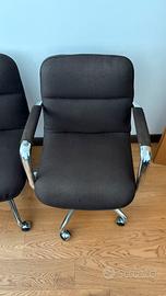 Disponibili 10 sedie girevoli con rotelle sedie da ufficio originali anni ’80/’90, ideali per uffici, sale riunioni, studi professionali o scrivania da casa. Struttura in metallo cromato, seduta e schienale imbottiti in gommapiuma e rivestiti in tessuto sfoderabile marrone scuro.