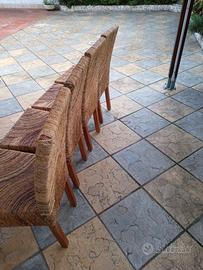 lotto di quattro sedie,struttura in legno, robuste, prodotto di qualita,rivestite da corde di banano, lievi difetti da uso ma complessivamente ancora ben utilizzabili, una ha una gamba che e stata incollata, si usa, magari e da prevedere un rinforzo per sicurezza, utilizzabili sia in interno che esterno.tutto come da foto .