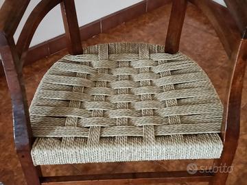 Vendo per inutilizzo due sedie vintage con schienale arrotondato e seduta in corda. Sono comode ma con un cuscino lo sono ancora di più. Non ho idea di quale legno sia stato usato per farle ma sono molto robuste e di buona fattura. Guardando le foto chi a buon occhio capisce che non sono robetta. Misure: Lunghezza 50 cm. Larghezza 40 cm. Altezza schienale 72 cm seduta 44 cm. Per chi fosse interessato la consegna avverrà presso il mio domicilio comune di Perloz bassa Valle d'Aosta in confine con il Piemonte. No spedizione.