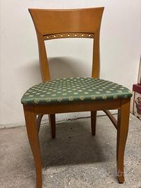 Sedie per ristorante realizzate in struttura in legno massello, lavorato su schienale e seduta imbottitura in spugna a e rivestita in stoffa liscia color verde con motivi dorati.