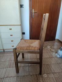 set di quattro sedie, modello rustica per cucina e sala da pranzo, robusta struttura in legno di noce nazionale massello, e seduta in paglia.