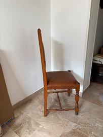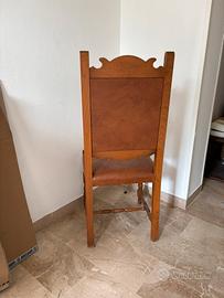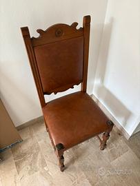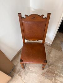 Set di 6 sedie vintage in stile neorinascimentale, realizzate in legno con finitura scura e seduta/schienale in cuoio, color cognac. Il prezzo si riferisce al singolo. Se si acquista l’interno set, lo vendo a 250€.