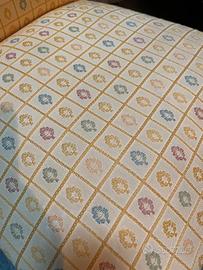 Vendo per inutilizzo 4 sedie in legno rivestite in tessuto giallo con motivi verdi, gialli, rosa.