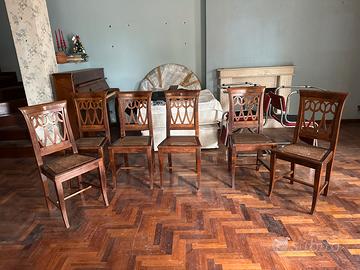6 eleganti sedie in legno con seduta in paglia di Vienna. Le sedie hanno piu di 70 anni. Sono solide e non hanno problemi. Chiaramente hanno segni di normale utilizzo.