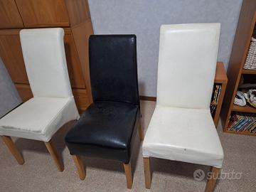 vendo n. 3 sedie in pelle e legno, due color avorio e una nera, le sedie avorio hanno segni di usura come mostrato nella foto.