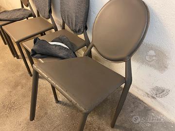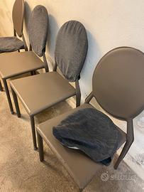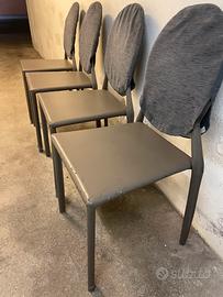 Vendo n. 4 sedie in pelle color grigio, molto comode e sane, copri spalliera in stoffa, usate ma con graffi del gatto come si può notare dalle foto.