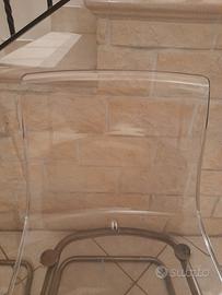Coppia di sedie in plexiglass trasparente e struttura in acciaio cromato. Marca Ikea, modello Tobias. La seduta di entrambe le sedie è danneggiata, come visibile nelle ultime due foto; possono essere utilizzate con un cuscino sulla seduta, riparate oppure si possono acquistare solamente la sedute nuove e montarle sulle basi cromate (si tratta di quattro viti a brucola per ciascuna sedia). Solide; plexiglass spesso. Il prezzo si intende per la singola sedia; sono vendibili anche singolarmente.
