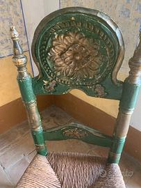 Sedie in legno intagliato e dipinto, in stile coloniale spagnolo del XVIII secolo. Poggiatesta intagliato come anche la doga dello schienale. Traversi che formano le gambe torniti con stile floreale. Barella anteriore bassa intagliata che imita la doga dello schienale.