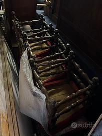 Sedie antiche in stile Jacobean Revival, struttura in legno intagliato con schienale a pioli e una seduta imbottita rivestita in velluto rosso. Penso sia legno di quercia o noce