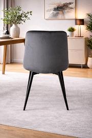 Set da 4 sedie rivestite in velluto grigio, con schienale lavorato a riquadri e struttura nera slanciata. Un set dall’estetica pulita e moderna, ideale per sala da pranzo, zona living o ambienti di rappresentanza.