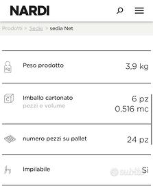 Vendo 6 sedie NARDI modello NET colore tortora, NUOVE MAI USATE (con etichetta originale ancora applicata). Il prezzo di listino è di €91, vendo a €60 ciascuna.