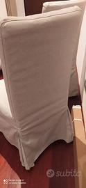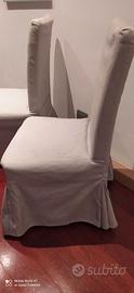 Nr. 4 sedie in legno massiccio per soggiorno, con seduta imbottita e rivestite con fodera in tessuto (lavabile). La fodera della sedia è un pezzo unico e si infila e sfila sulla sedia, così puoi metterla e toglierla facilmente. Il peso max sostenibile è di 110Kg. Compreso nel prezzo anche una seconda fodera per le quattro sedie.