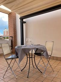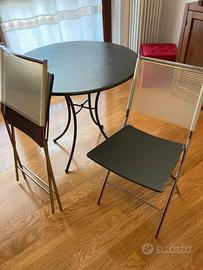 2 sedie di design dell'Architetto Emilio Nanni realizzate dalla FlyLine nell'anno 2000. NO TAVOLO. Seduta in formica rivestita, telaio in acciaio lucido e schienale in nylon. Usate sempre in casa ma potrebbero essere impiegate anche all'esterno. Mis: H totale 82, H seduta 48, seduta 39 larga x 36 profonda. Schienale 35 cm sopra e 38 cm alla seduta, le gambe ingombrano 36x40cm Stato di conservazione: ottimo stato con leggerissime ed accettabili segni di usura. Spedizione 15 euro la coppia, con correire 24/48h. Ideale per casa vacanza B&B appartamento in affitto monolocale. Per servire la colazione o un caffe. A mano invece sono a Roma Nord, Boccea, Eur o Pomezia. Info 3404031890