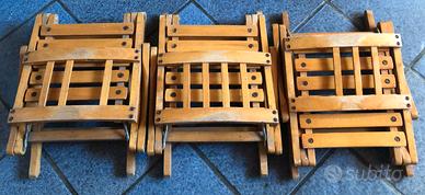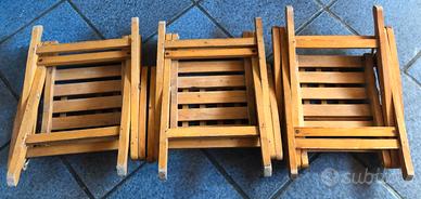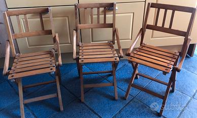 3 Sedie pieghevoli bimbo anni ‘50 legno massello Dimensioni: altezza cm 53.5, larghezza cm 29, profondità cm 31 seduta cm 27x25.5, altezza seduta cm 30 Dimensioni chiuse e piegate cm 40x28.5x12 Peso delle 3 sedie: kg. 3.9 Le sedie, come da foto, presentano segni di usura, il meccanismo di chiusura funziona correttamente, lo schienale di 2 sedie è sprovvisto di una bacchetta, ciò non compromette la stabilità delle sedie. Prezzo della sedia completa delle 4 bacchette sullo schienale € 50 Prezzo delle 2 sedie sprovviste di 1 bacchetta € 70 Prezzo delle 3 sedie € 100 Possibilità di ritiro a Cuneo