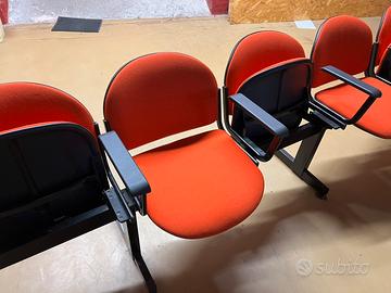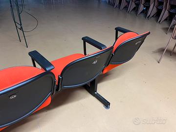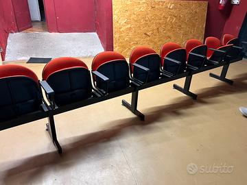 Sedie su trave di ferro. Poltroncine per teatro, cinema o sala riunioni, piedi con ventose, restano ben salde a terra senza bisogno di fissarle con bulloni. Disponibili circa 120 sedute in file da 8 (divisibili a metà togliendo 2 bulloni) e da 5