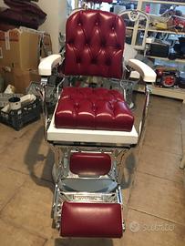 Antiche poltrone da barbiere Scuderi Catania con seduta rotonda, originali dell'epoca, completamente restaurate, fatturabili. Vari colori disponibili, tutte dotate di pistone idraulico, rivestimenti in vera pelle pieno fiore di prima scelta.