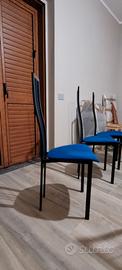 Vendesi 6 bellissime sedie moderne in metallo nero opaco con schienale avente stecche più piccole blu. La seduta è in tessuto antimacchia blu elettrico.