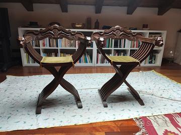 Vendo coppia di sedie Savonarola in legno massello intagliato, dallo stile rinascimentale e ricco di dettagli decorativi, con teste di leone scolpite sui braccioli.