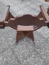 vendo due sedie in legno Savonarola , una con intagli di teste di leone sui braccioli l'altra semplice , ma entrambe hanno motivi floreali sullo schienale .