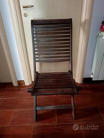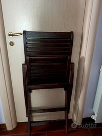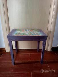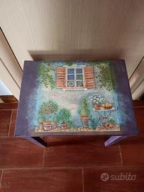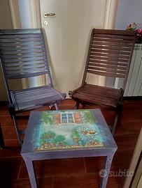 Elegante salottino da esterno con sedie, richiudibili, in legno massello e tavolino rifinito con decoupage pittorico.