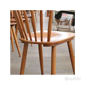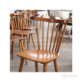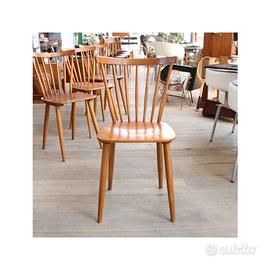 Linee pulite, schienale sottile con listelli verticali, seduta comoda e struttura in legno massello curvato, lavorato con la tradizione che ha reso famosa la scuola boema.