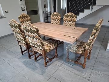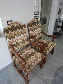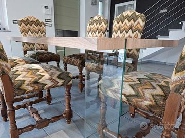 Set sedie in legno massello con rivestimento vintage Vendo elegante set di sedie in legno massello, robuste e di ottima qualità, perfette per sala da pranzo o cucina. Le sedie presentano una struttura solida con gambe tornite e dettagli classici, abbinate a un rivestimento in tessuto con fantasia geometrica in stile vintage che dona carattere e originalità all’ambiente. Comode e spaziose, alcune sedie sono dotate di braccioli per un maggiore comfort. Caratteristiche: - Struttura in legno massello - Seduta e schienale imbottiti - Rivestimento in tessuto fantasia (stile vintage) - Gambe lavorate con finiture classiche - Sedie con e senza braccioli Condizioni: ottime, normali segni di utilizzo ma perfettamente funzionali. Ideali da abbinare a tavoli sia moderni che classici per creare un contrasto elegante.