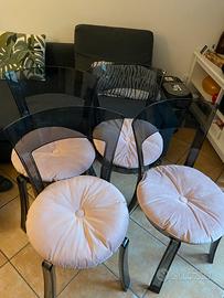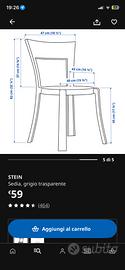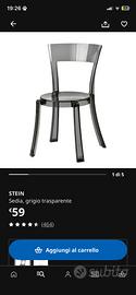 vendo 4 sedie in PERFETTE condizioni, trasparenti modello stein di ikea nella versione scura. le ho da un anno ma le ho usate veramente poco perche non mi siedo mai a tavola e le ho sempre tenute con i cuscini come si vede in foto quindi non si sono rovinate! :) le sedie sono 4 e le vendo a 50€ l’una abito in zona milano sud sono anche impilabili quindi comodissime io le ho portate a casa in una panda tranquillamente (occupano poco spazio) per maggiori info scrivetemi pure!!