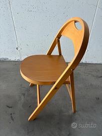 Set di quattro sedie pieghevoli Tric disegnate da Achille e Pier Giacomo Castiglioni per BBB Emmebonacina nel 1965. Tric è una sedia pieghevole universale, dalle linee pulite e rigorose. La struttura è in legno massiccio, con schienale e seduta in compensato sagomato. Il design si ispira alle forme rotonde degli anni '30. La sua creazione è stata resa possibile dalla collaborazione con BBB Emmebonacina nel 1965, un'azienda caratterizzata da innovazione e ricerca. La sedia è molto pratica anche perché pieghevole ed è quindi possibile riporla in spazi contenuti quando non viene utilizzata. Condizioni buone con qualche imperfezione . Altezza della seduta: 48 cm.