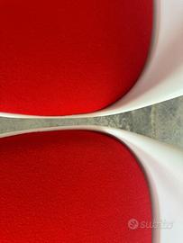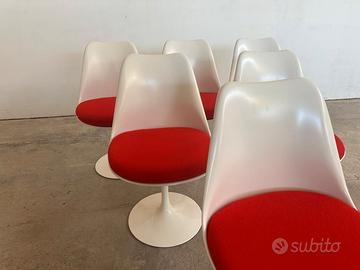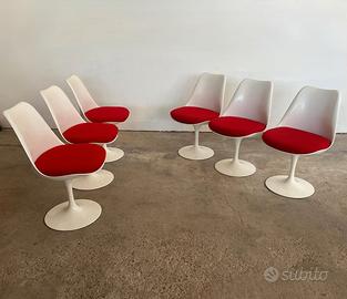 Set di 6 sedie Tulip Saarinen Knoll girevoli bianche con cuscino rosso, la Tulip è la sedia icona originale del design del '900 ispirata all'eleganza e al romanticismo di un petalo di tulipano, progettata da Eero Saarinen per la collezione Pedestal. Usate raramente le sedie sono in ottimo stato